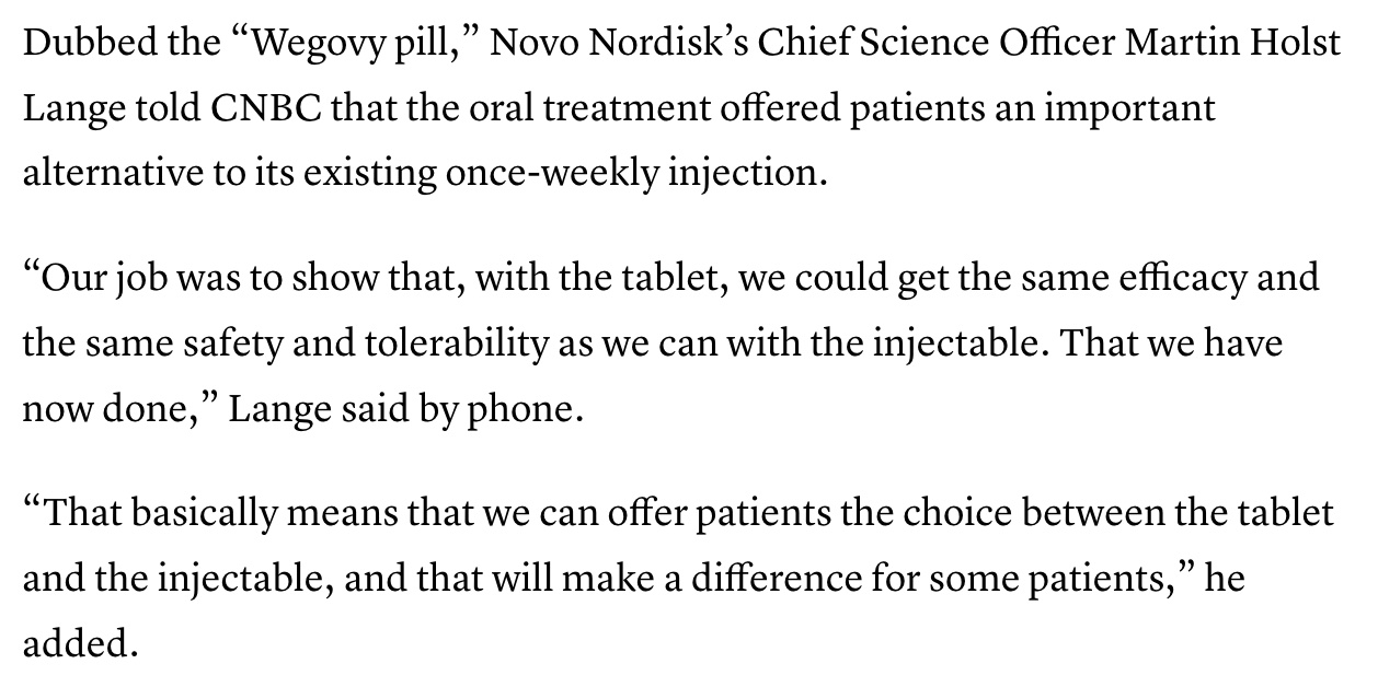 BIG NEWS yesterday about the efficacy of the "Wegovy Pill." The CNBC article detailed how late-stage trial results for Novo's once-daily obesity pill showed “significant” weight reduction and tolerability in line with its blockbuster Wegovy injection. Since there are currently no-FDA approved oral GLP-1 medications on the market, how hopeful are we that the injectable nature of these medications may be a thing of the past?!!??!